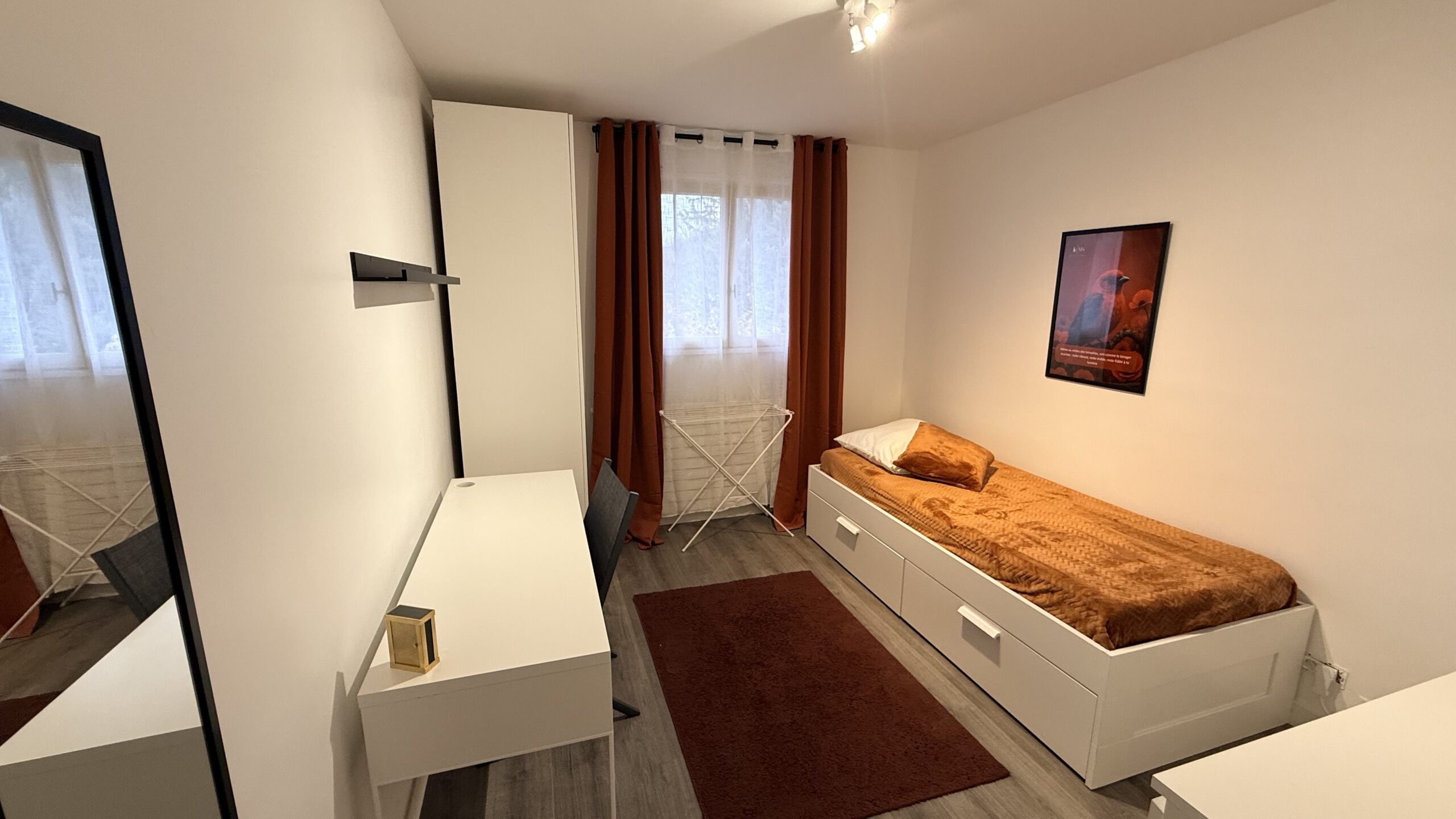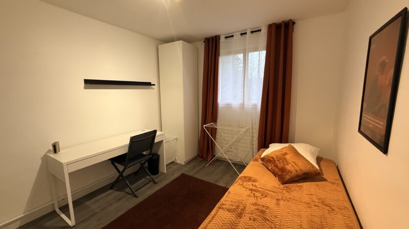 Elle dispose d’un lit Double confortable, d’un grand bureau pour étudier ou télétravailler, ainsi que d’espaces de rangement pratiques.