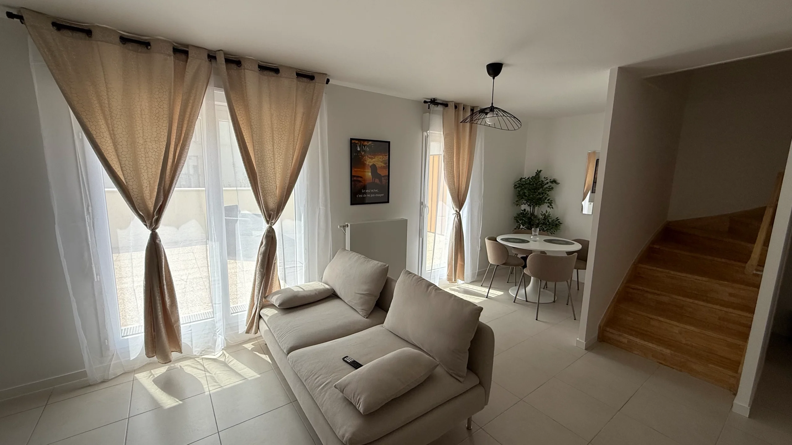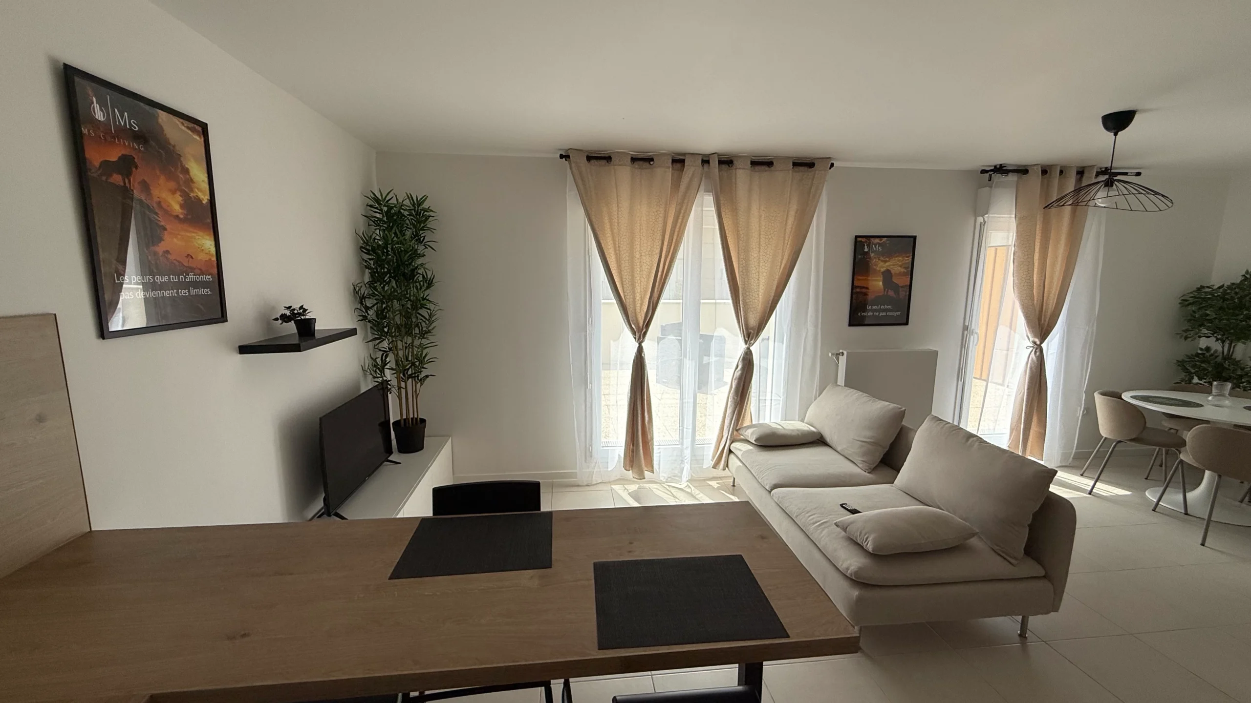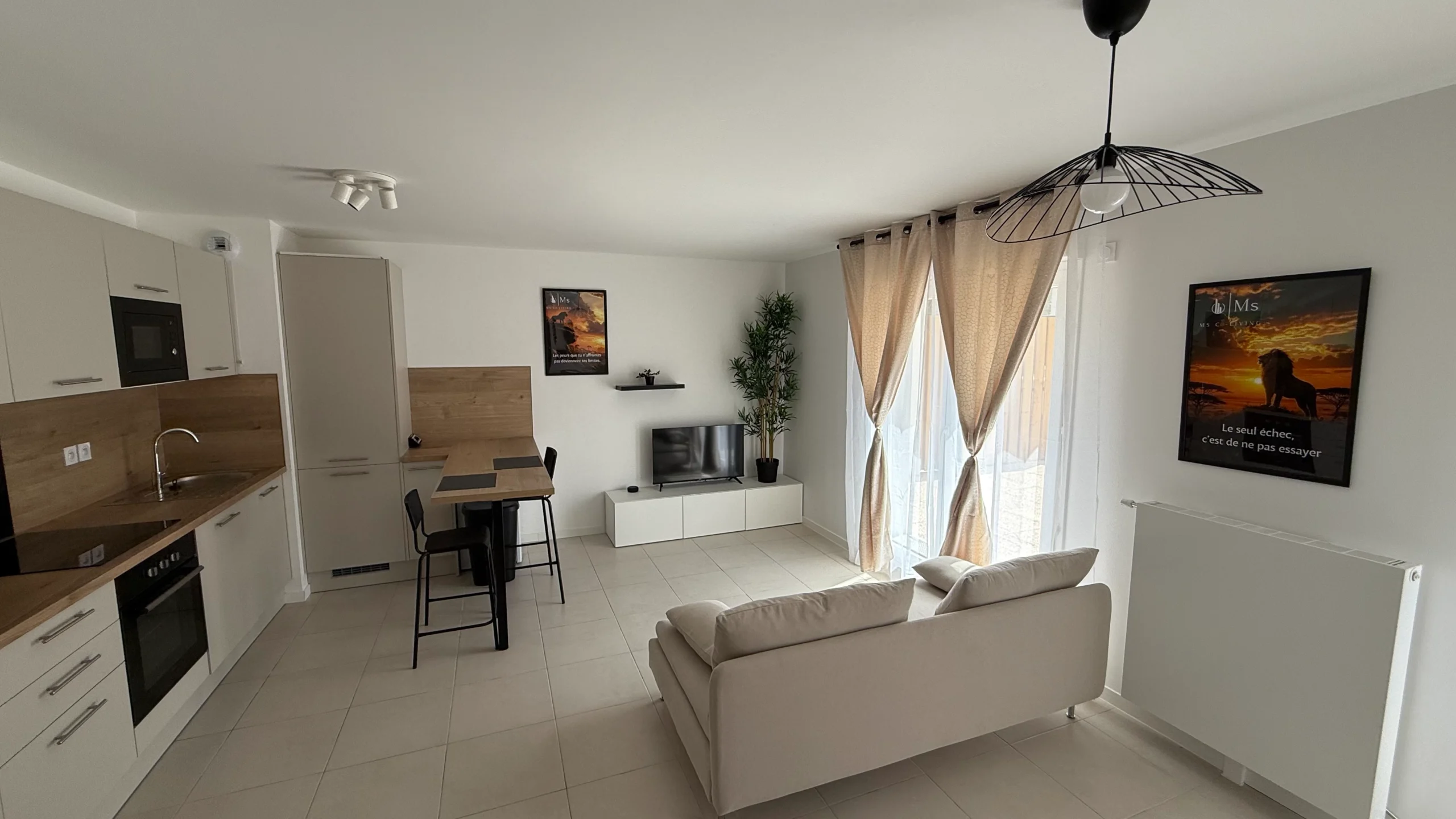 L’appartement est moderne, lumineux, et offre un accès privilégié aux grandes terrasses pour profiter de l’extérieur.