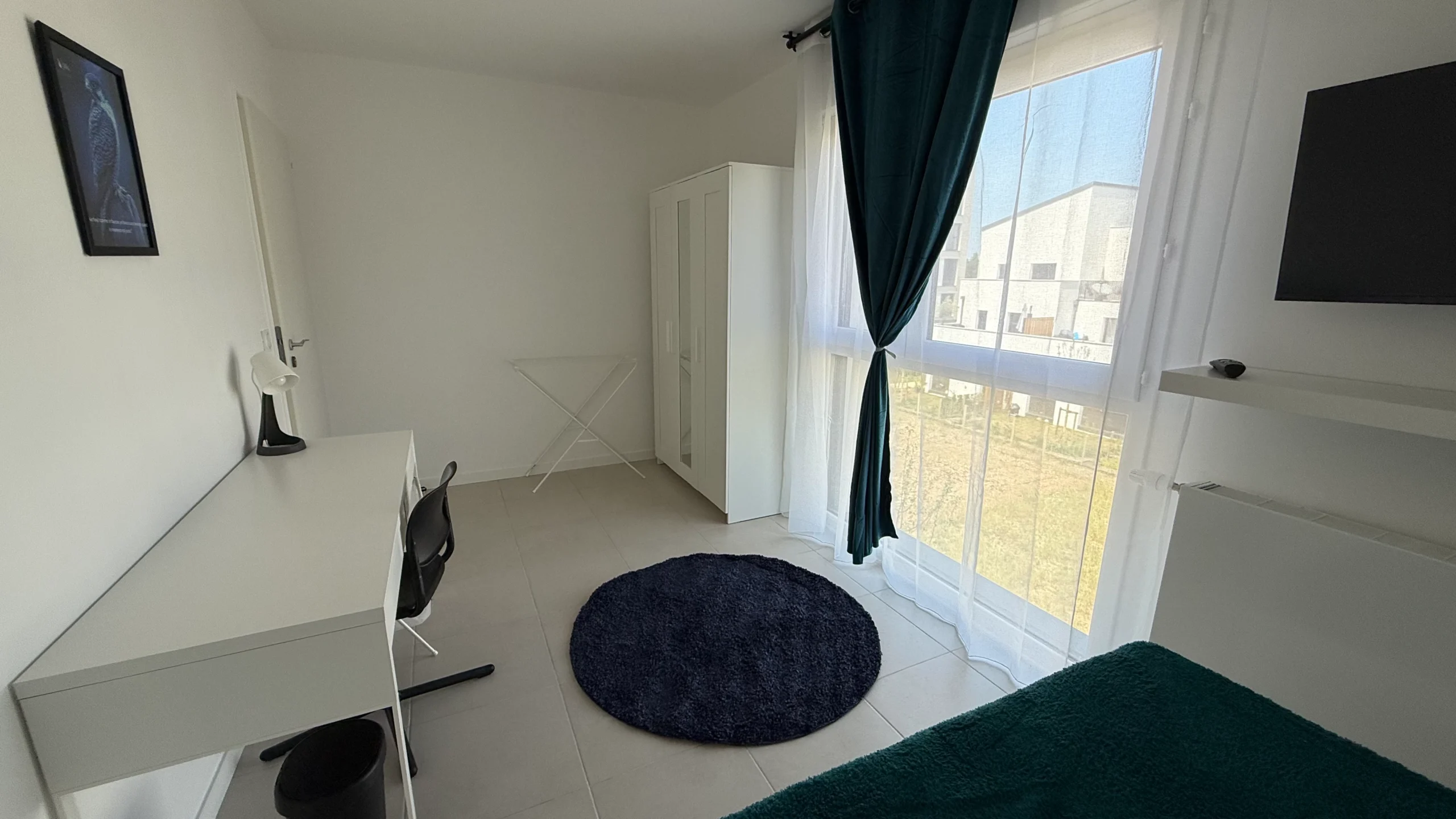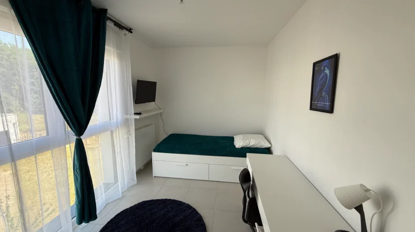 Elle dispose d’un lit simple confortable, d’un grand bureau pour étudier ou télétravailler, ainsi que d’espaces de rangement pratiques.