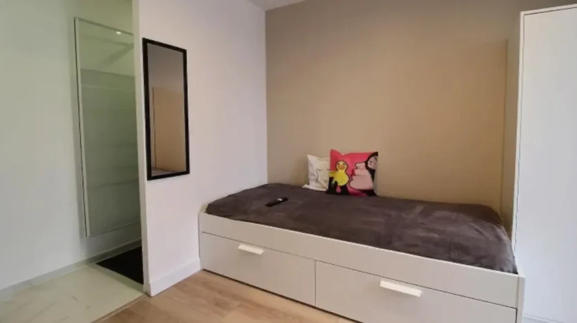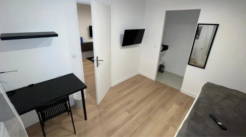 Elle est équipée d’un lit confortable, d’un grand bureau, et de nombreux rangements pour un espace à la fois pratique et agréable.