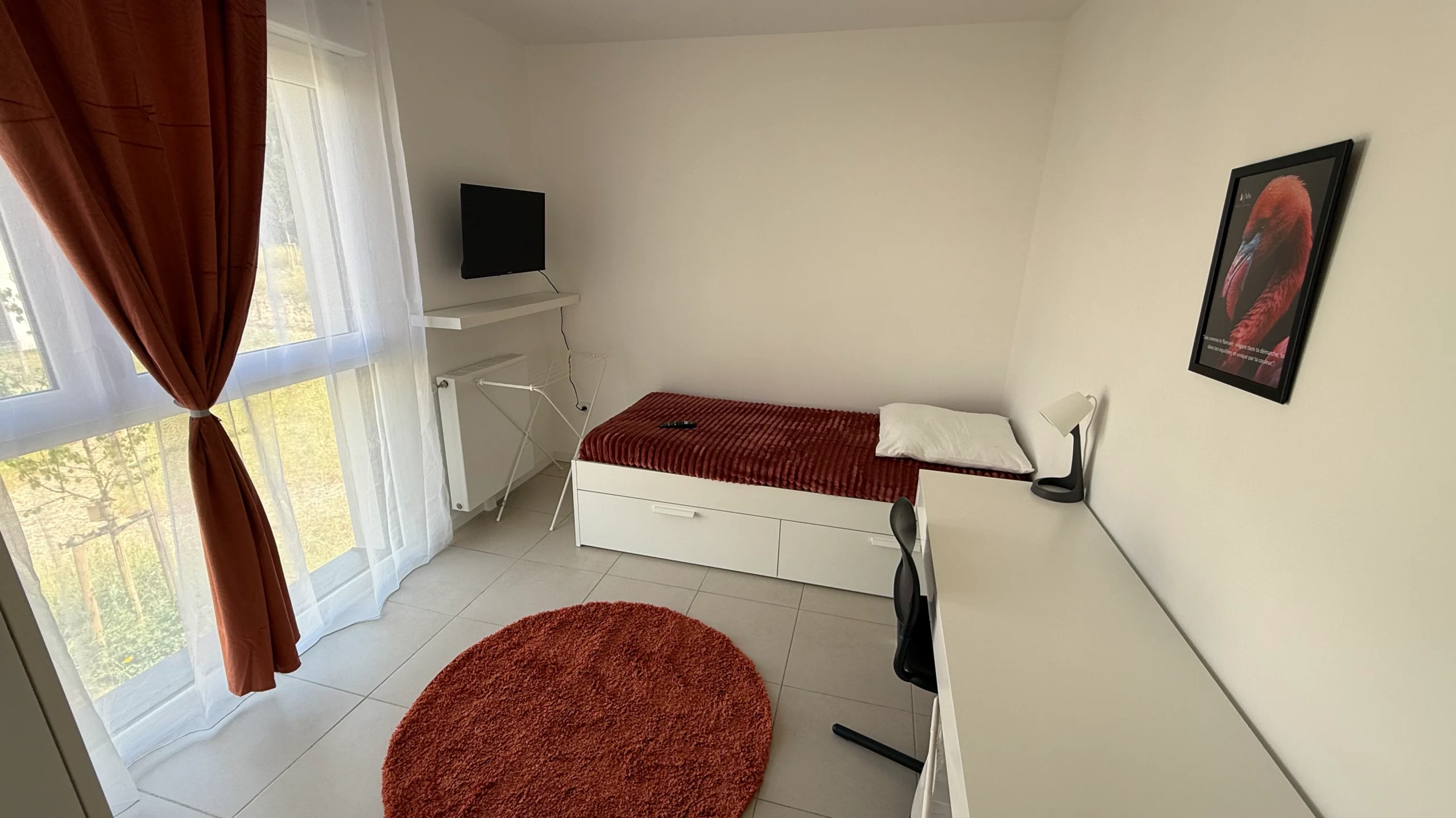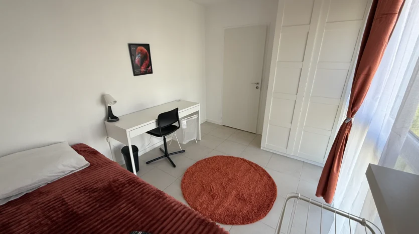 Elle dispose d’un lit simple confortable, d’un grand bureau pour étudier ou télétravailler, ainsi que d’espaces de rangement pratiques.